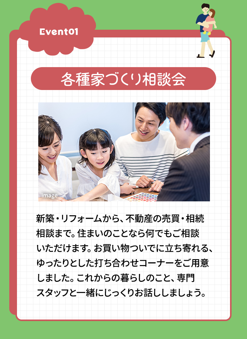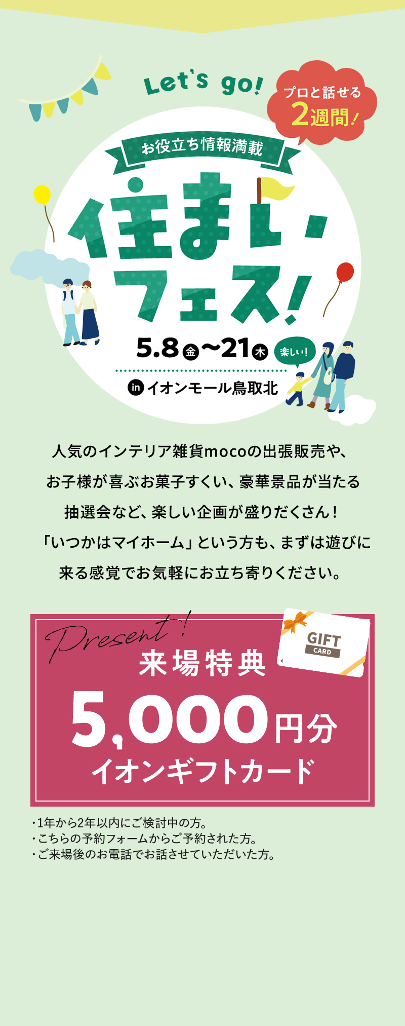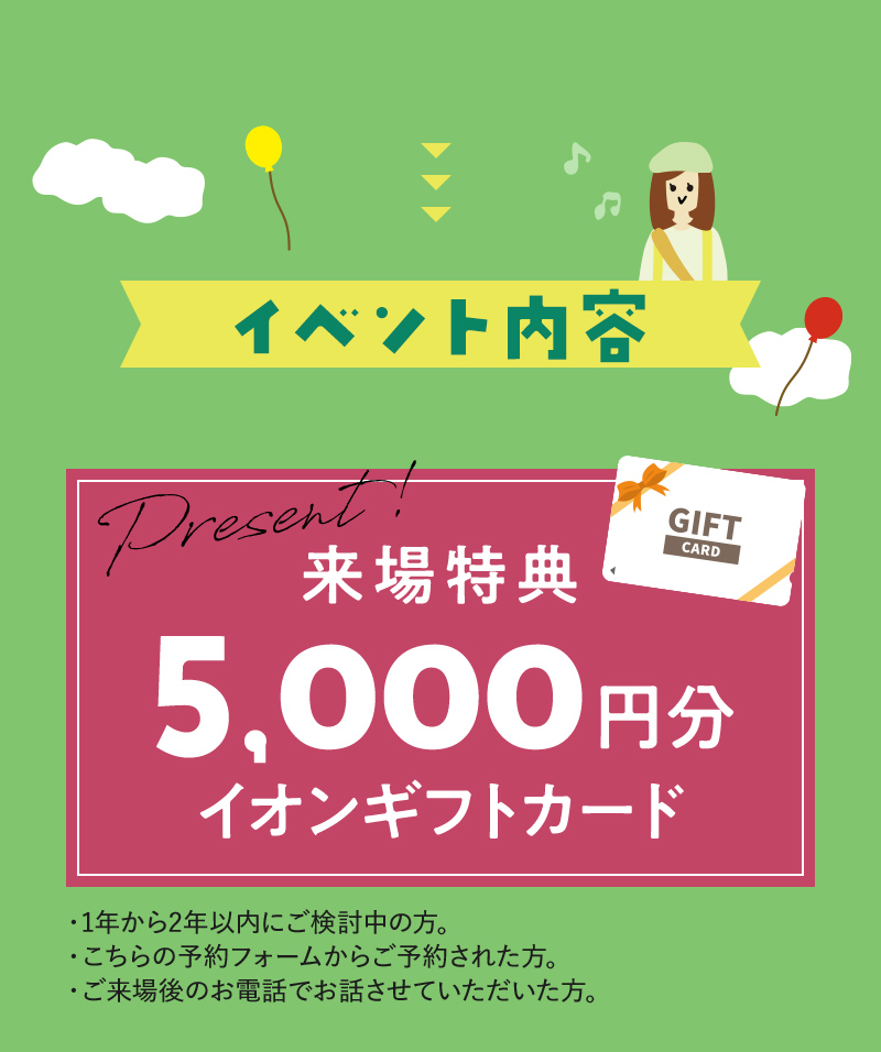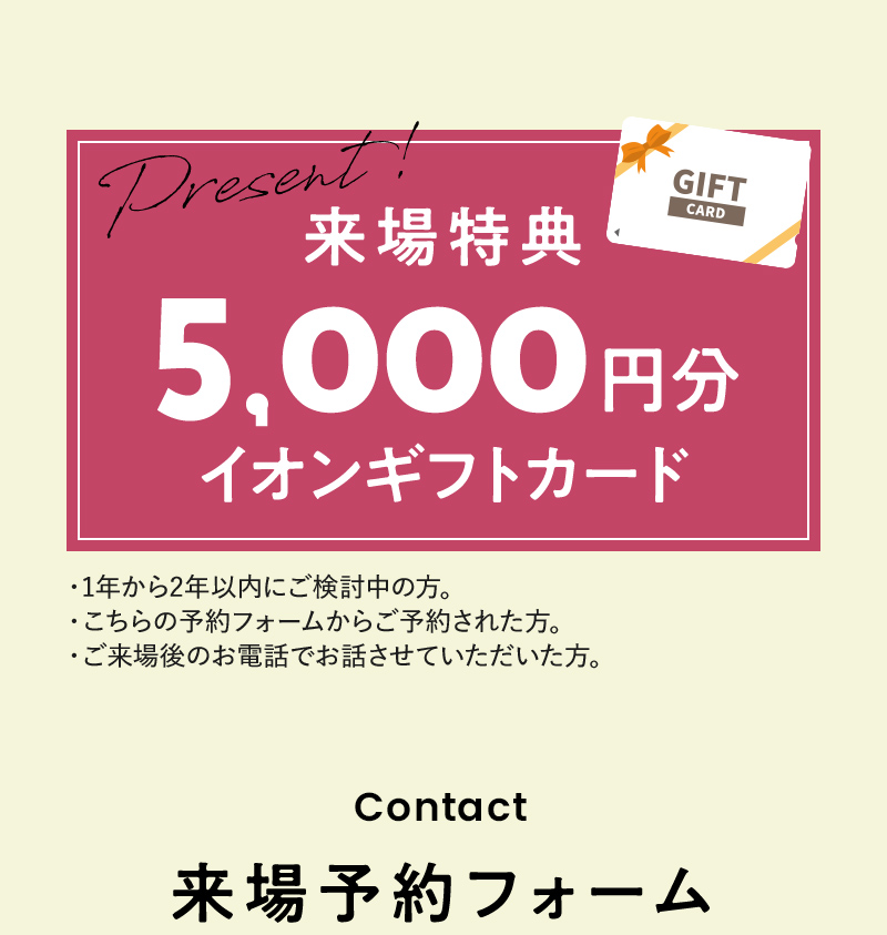 来場希望日 時間を選択してください10:00~11:00~12:00~13:00~14:00~15:00~16:00~17:00~ 相談したい内容 新築住宅について不動産についてリフォームについて外構についてその他 お名前 ふりがな 住所郵便番号 都道府県 都道府県を選択北海道青森県岩手県宮城県秋田県山形県福島県茨城県栃木県群馬県埼玉県千葉県東京都神奈川県新潟県富山県石川県福井県山梨県長野県岐阜県静岡県愛知県三重県滋賀県京都府大阪府兵庫県奈良県和歌山県鳥取県島根県岡山県広島県山口県徳島県香川県愛媛県高知県福岡県佐賀県長崎県熊本県大分県宮崎県鹿児島県沖縄県 市区町村 番地・建物名 電話番号 メールアドレス イベントご参加人数 その他ご質問など プライバシーポリシーを確認してください 内容を確認し、同意しました。
