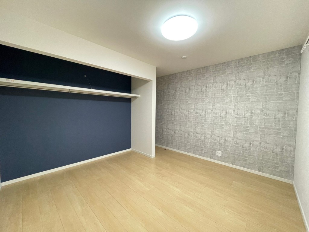 ブルーグリーンのキッチンがアクセントとなり、落ち着いた雰囲気の中にも個性が感じられる仕上がりです。