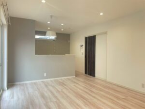 キッチンからリビングまで一直線につながるLDKは、視線が抜けることで開放感を感じられる空間となっています。