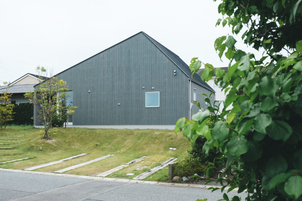 深い色合いの外壁と伸びやかな屋根のラインが、すっきりとした佇まいをつくっています。