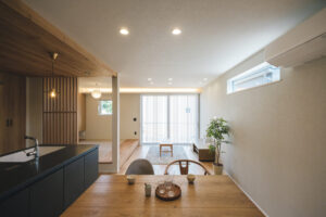 リビングとダイニング、キッチンがゆるやかにつながり、家族の気配を感じながら過ごせる空間になっています。