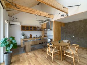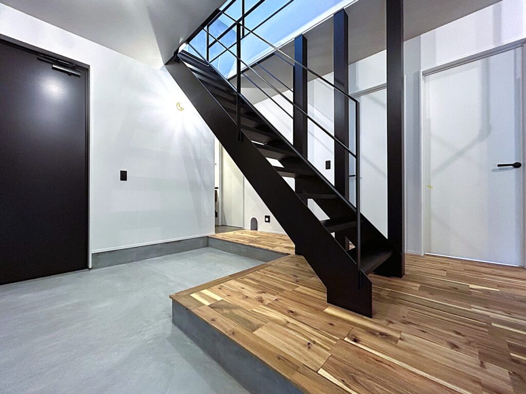 玄関の土間スペースや造作棚、収納空間など、暮らしの道具を整えながら過ごせる工夫が随所に散りばめられています。