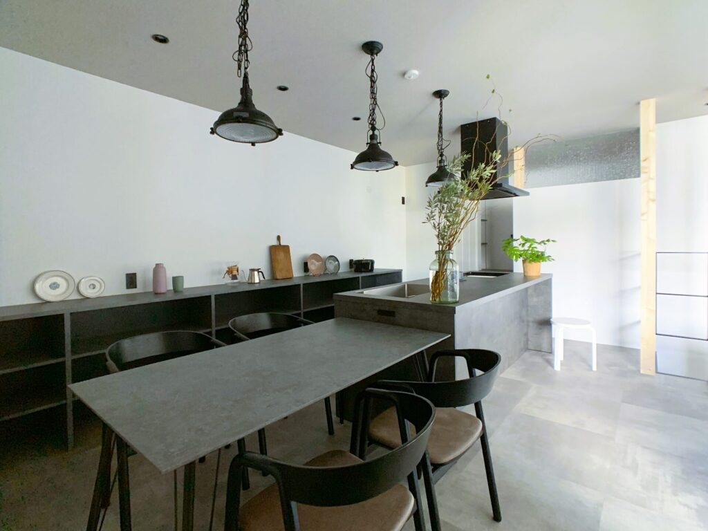 ペンダント照明が並ぶカウンターキッチンは、料理や食事の時間をゆったり楽しめる場所です。