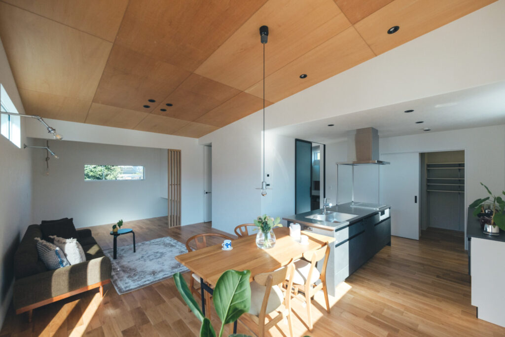 木の天井がやさしく広がるLDKを中心に、ゆったりとした時間が流れる住まい。