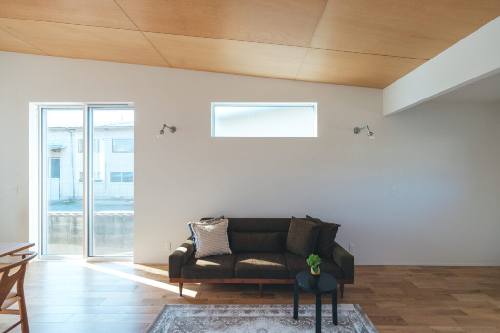 木の天井が空間にやさしいアクセントを加えるリビング。