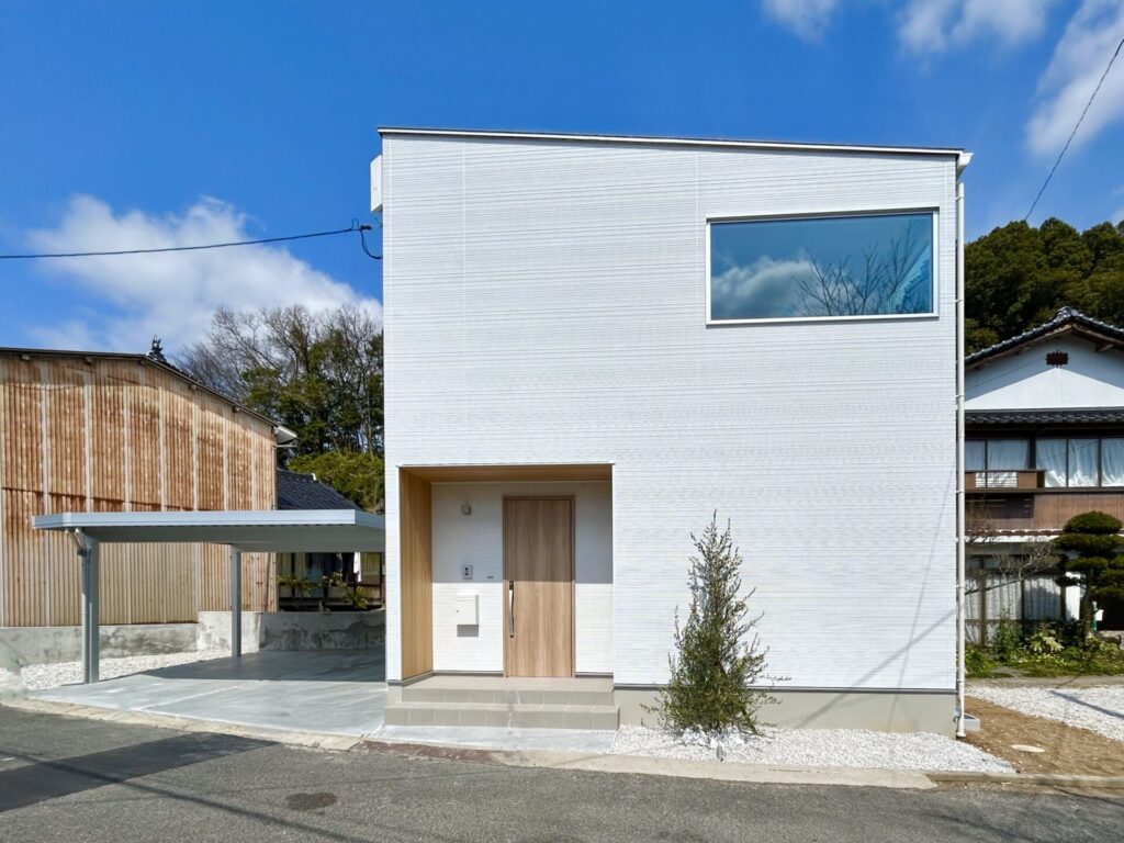 白い外壁と木の玄関ドアが調和した外観デザイン。