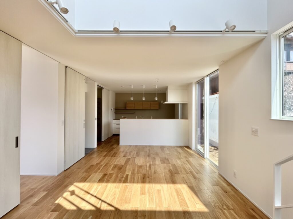 吹き抜けの階段からたっぷりと光が入り、LDK全体を明るく包み込みます。
