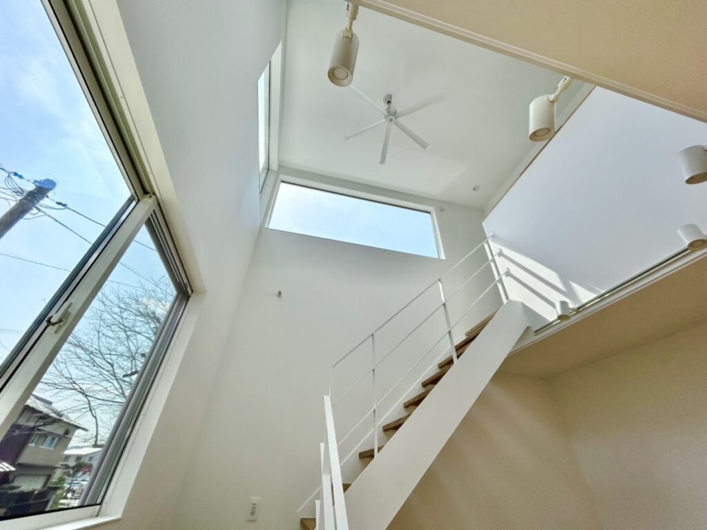 大きな窓と吹き抜けが開放感を生み出す階段スペース。