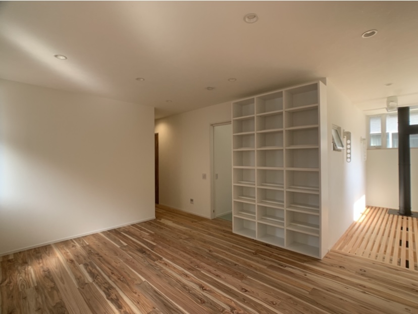 リビングには大きな造作棚を設けました。