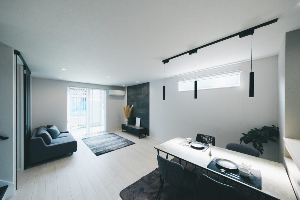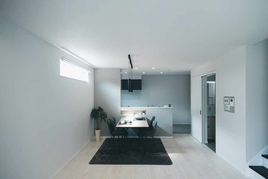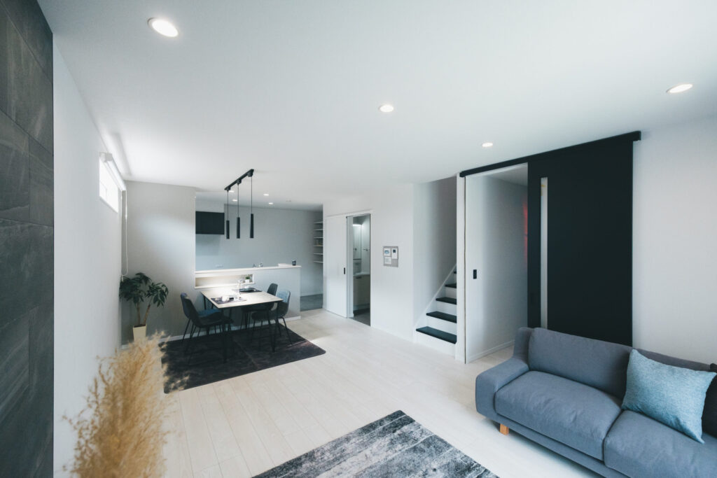 落ち着いたモノトーンの色合いでまとめた、開放感のあるLDKが印象的な住まい。